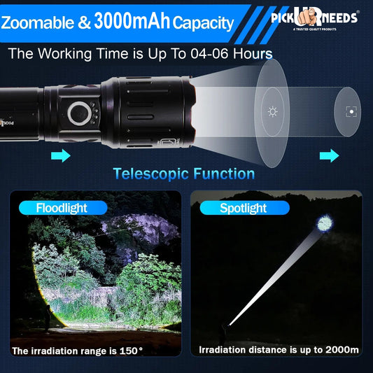 Pick Ur Needs 150W Rechargeable LED Torch offers powerful brightness, zoomable focus, 6 ...