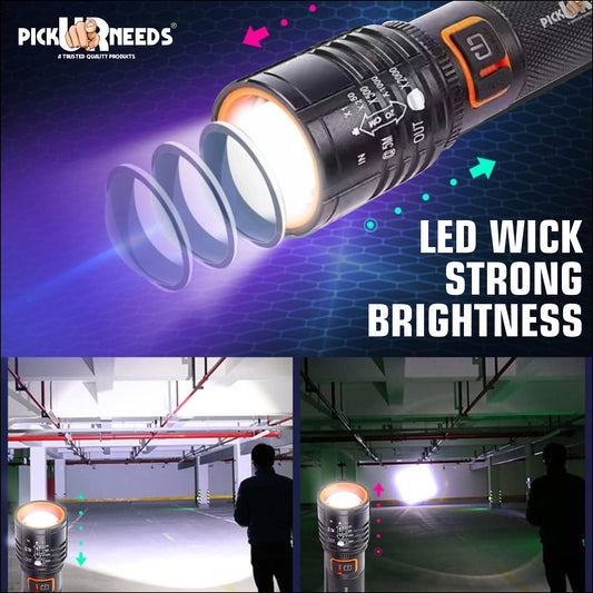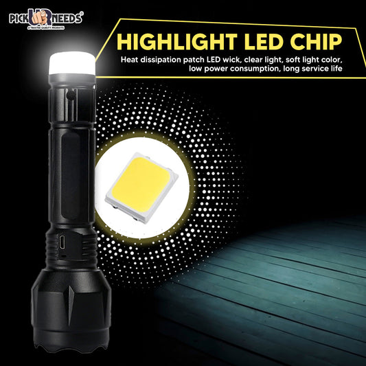 Pick Ur Needs 200W Rechargeable LED Flashlight with Zoom, Type-C Fast Charging, COB Side Light, Waterproof Torch for Camping,Hiking,Outdoor & Emergency Use